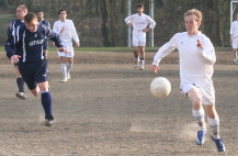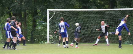 Avec la visite de Blue Socks à Kapelleveld, les Chiefs1 escomptaient bien enrichir leur capital de 3 nouveaux points, et ce malgré le deuxième tour de ... suspensions. Début de match prudent, le temps de tester les forces en présences, et les locaux s'installent résolument dans le camp visiteurs. Après quelques occasions timides, les kapellois osèrent un peu plus, les ripostes adverses se faisant rares. Fabien eut l'occasion de se mettre en évidence, mais ce sont les Chaussettes Bleues qui ouvrirent la marque contre le cours du jeu, erreur de marquage dans l'axe et PAN, tir en cloche en pleine lucarne, David n'avait rien vu venir ! La réaction des kapellois ne se fit pas attendre, et après un essai manqué de Fabien, German remettait les équipes à égalité suite à un 'En Avant' (expression à la mode du moment) de JR. Les kapellois continuèrent leur siège, mais c'est à nouveau sur un contre qu'une chaussette bleue s'infiltrait trop facilement, et redonna l'avance aux visiteurs, 1-2 à la pause. Les Chaussettes Noires ne se découragèrent heureusement pas et, très vite revinrent au score suite à un numéro de Fabien qui mystifia la défense adverse sur une superbe passe de Matthias. Les Chiefs 1 n'en restèrent pas là, et à 20 minutes du terme, ils prirent l'avance au marquoir du 'Chiefs Giant Stadium' par ... Fabien sur une ouverture de la tête de Jip. On croyait les locaux relancés, mais sur une erreur d'appréciation, les visiteurs revinrent encore au score : 3-3. Dès ce moment, il n'y en eut plus que pour les locaux qui acculèrent Blue Socks dans son but, mais malgré deux "ENORMES" occases, le score ne changea plus, les Chiefs ont perdus 2 points importants, qu'ils méritaient largement de prendre. La semaine prochaine, un tout autre match nous attend, et comme dit Jey, c'est le couteau entre les dents et la hache de guerre à la main que les braves de la 1 iront damner le pion aux tuniques bleues de Bousval ! Fabien (2 buts), c'est 3-3, German insatisfait...