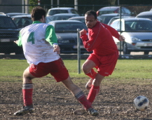 Après la descente aux enfers engendrée parles évènements de ces 10 derniers jours, les Chiefs 1 se devaient de redresser la tête, et surtout de redorer leur image aux yeux de tous. Ce faisant, on ne fait pas une omelette sans casser des œufs, et si certains ont pris la porte, d'autres ont préféré se retirer. Les rescapés de cette aventure avaient à cœur de prouver que les Chiefs 1 forment aussi un groupe, qu'ils savent se battre l'un pour l'autre et tirer tous dans la même direction. C'est donc une équipe remaniée qui démarrait les hostilités, mais très vite on pu se rendre compte que tout le monde en voulait et s'encourageait. Bien que le jeu en lui-même n'atteignit jamais des sommets, il est fort agréable de constater que l'envie de jouer ensemble et pour le groupe ramenait sur le terrain une cohésion. Les Chiefs cherchaient leurs marques en début de match, et sur la première vraie action construite, il ouvrirent le score par le Vince (ballon arraché par Matthias vers Gary, centre vers German et déviation vers Vincent : 1-0); et si la boue ne s'en était pas mêlée, le score aurait pu être plus lourd à la pause. En deuxième période, départ sur les chapeaux de roues, centre de Gary, le gardien, pressé par Vincent se loupe, et qui suit bien ... ? Vincent 2-0. Après un triple changement, JR retrouvant les avants postes, Mario son axe et Bertrand son flanc, rien ne changea réellement, la cohésion et l'envie subsistaient, et les incursions des joueurs de Saint-Joseph (fort nerveux et fort en gueule) restaient fort sporadiques. Les kapellois pratiquaient en contre, et Oli, bien lancé en profondeur, mystifia la défense et le gardien adverse pour faire 3-0. Là, les locaux se désunirent quelque peu, cafouillage en défense et penalty (pour une faute en dehors de la surface). David, dont l'envie était énorme, n'en fit qu'une bouchée et se détendit du bon côté. Mais les visités ne parvenaient plus à sortir, et finalement, St-Joseph réussi à planter une rose avant que sur un dégagement de David, German ne dribble la défense visiteuse et fixe le marquoir à 4-1. Conclusion : les Chiefs 1 sont sur la bonne voie, il y a une réelle envie de reconstruire quelque chose, cela s'est vu avant, pendant et après le match. Les joueurs se sont fait plaisir et ont éprouvé un réel plaisir à jouer ensemble. Dans un tel contexte, les choses ne peuvent aller qu'en s'améliorant, prenons notre pied chaque samedi, et le reste suivra ! Rendez-vous dans 15 jours. [Claude] Les Chiefs 1 rterouvent l'envie de jouer ...